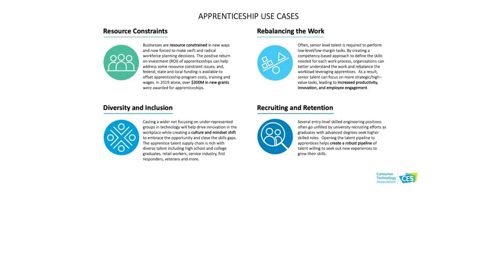 To address the challenges of starting an apprenticeship program during a time of such uncertainty, the Consumer Technology Association (CTA)® interviewed members of the CTA Apprenticeship Coalition, each in a different stage of their journey to create or run an apprenticeship program. Through these interviews and industry research, CTA and our industry partner IBM created a playbook to help build stakeholder awareness and buy-in for apprenticeship programs.